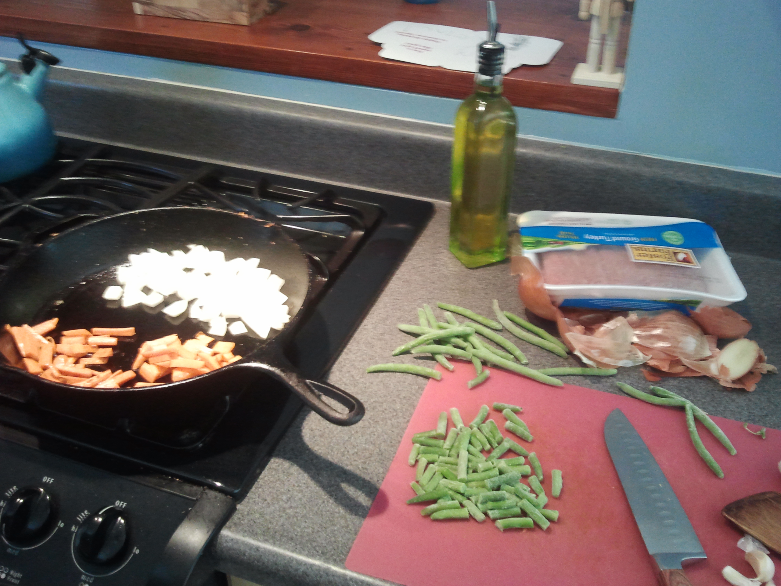 So I’m going to show you what we’ll have eaten in a 24 hour period by breakfast tomorrow. We’ll begin with lunch today. I started by attempting to make a pieced-together version of pad gra pao gai from Thailand, minus the rice (because we’ve cut that out temporarily) and the egg (because we ran out yesterday).