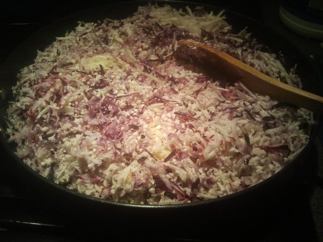 Here’s a picture from yesterday’s dinner: cauliflower and rainbow carrots from the La Mesa farmer’s Market and radishes from our garden (grated together in the food processor). By the time I was done sauteing them, the entire dish was a lovely purple (black carrots have a strong dying effect, much like a beet). This was an unexpected, but fun result. The kids ate it (once they were assured it wasn’t cabbage) and enjoyed it. I served chicken baked in salsa and then sauteed with mushrooms (also a market purchase) over the rice.