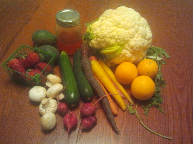 This way of thinking is beginning to change for us. Our priorities are shifting from saving as much money as possible on food to buying higher quality food, grown by people who are paid a fair wage. We believe that we have been given a Good Life in order that others may experience the Good Life as well. This sounds preachy, but for this week, it just meant that the kids and I went to our local farmer’s market and actually did some real grocery shopping. I set out with $40 and came home with 1 bunch of rainbow carrots, 2 hass avocados, 3 Zucchini, 3 baskets of strawberries, 5 lbs of oranges, 1 large head of cauliflower, 1 lb of mushrooms, 1 dozen eggs, 1 pound of dates, and 16 oz of Kombucha. The kids and I had a lot of fun taste-testing, interacting with the vendors and selecting from the colorful options. Little B even tried to get away with an extra bunch of carrots while strapped to my back, unbeknownst to me.