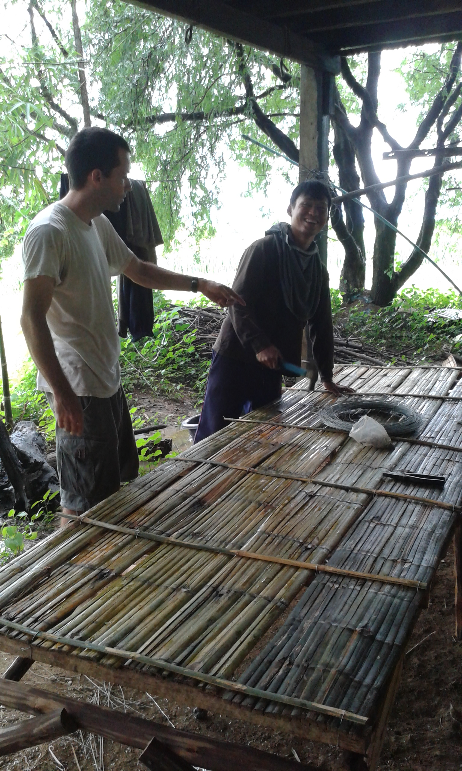 Sak Chai, our farm manager, and myself discussing next steps for the nursery. This is one of the finished tables.
